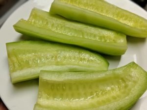 - Peel the cucumber and scoop off the seeds with a spoon.